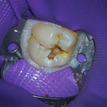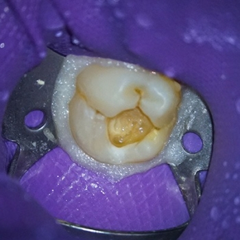 Fig. 1. Tooth no. 19 with deep caries. Total isolation prior to the removal of caries.