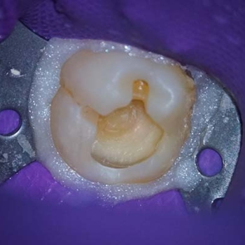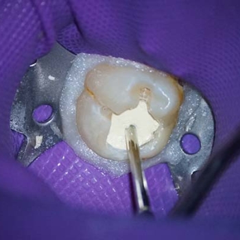 Complete sealing was achieved using a rubber dam, a stainless-steel Clamp, and a light-curing Flowable dam located around the clamp to prevent bacterial contamination of the area to be treated. The caries were removed circumferentially from the coronal towards the cervical margin to limit the movement of bacteria to the pulp tissue space (9). An exploration of the cavity preparation floor showed a pulp exposure (Figs 3 & 4). It is always advisable to explore the cavity preparation floor with an endo explorer, because smaller carious-exposed pulps may be overlooked.