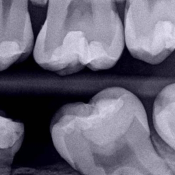Fig. 2. Bite radiograph shows evidence of a carious lesion of tooth 19. Undermineralized tissue is found close to the mesial pulp horn.