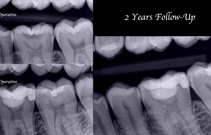 One of the main characteristics of Biodentine is that it is easy to manipulate, it can be used as a dentine substitute due to its high compression strength and offers good adhesion to the tooth structure. Its characteristics mean that it is easy to place it in the region to be treated and can be used as a base for the definitive adhesive coronal restoration. Fig. 9 shows the vital pulp therapy procedure. In radiographic form, on follow-up after two years, it is possible to observe mesial pulp horn retraction. One of the most appreciated advantages of Biodentine is that it does not pigment the tooth structure, making it an ideal material for performing pulp capping in the anterior sector.